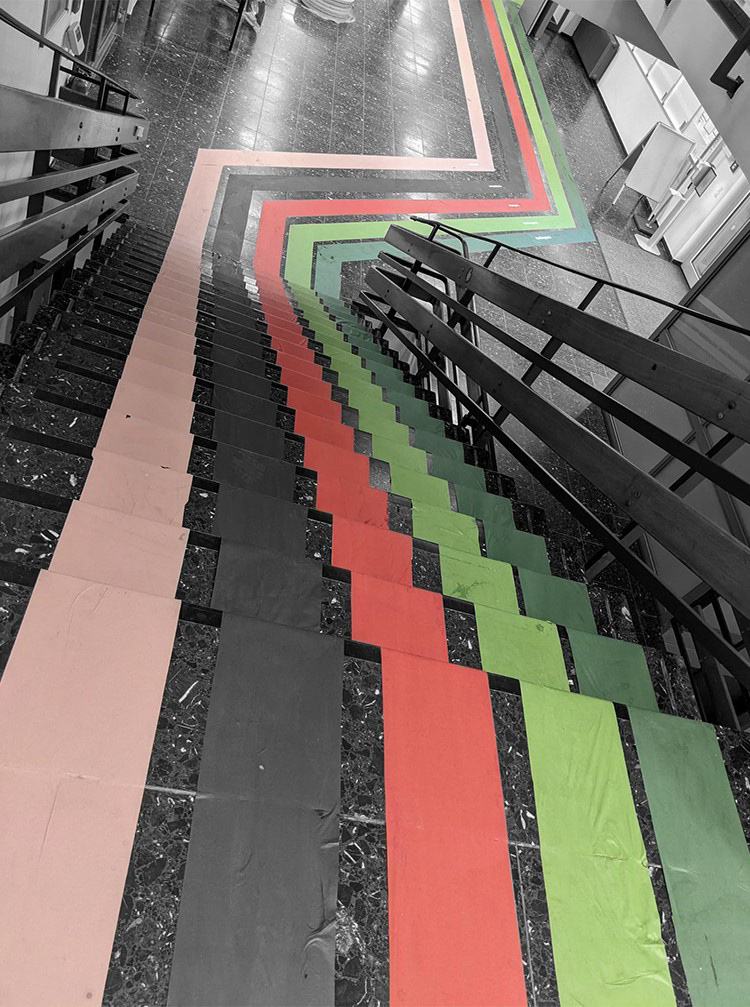 FH Aachen, Jahresausstellung. Einzelne Wege führen vom Eingang zu den unterschiedlichen Themen-Räumen. Die Besucher laufen ihre ausgewählte Bahn ab, um ihr Wunschziel zu erreichen. Alle Wege sind, ähnlich einem U-Bahn-Netz, durch eine Farbe markiert. Sie führen zu verschiedenen Stationen, wie den Ausstellungsräumen, der Kaffeebar und dem Symposium. Dieses Netz spiegelt sich auch im Ausstellungsplakat wider.