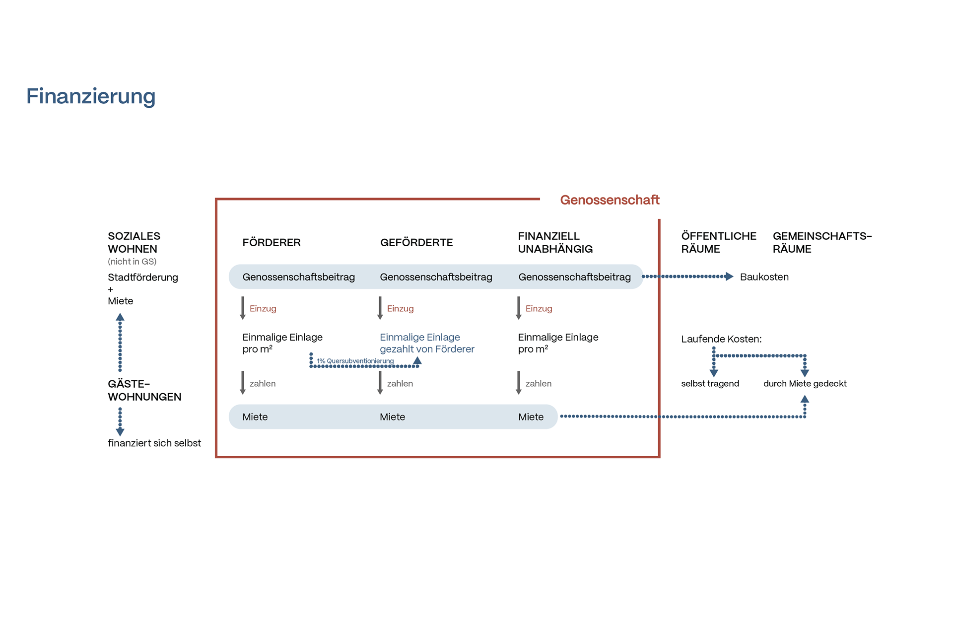 The residents of the housing co-operative should be able to live through their different life requirements as if in a cycle without having to change their place of residence and remain living in the co-operative. A system of sponsors and patrons ensures access for people from different financial backgrounds. The project presupposes an altruistic mindset, promoted by people who believe in a more experimental living concept.